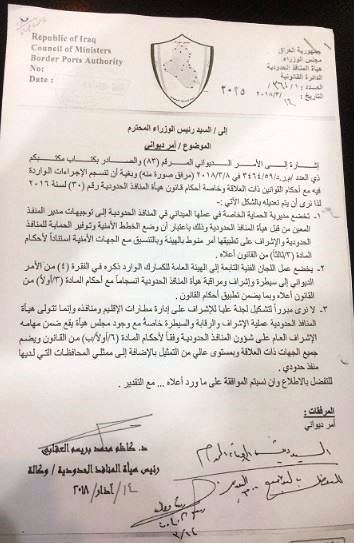 وجاءت في وثيقة اخرى وهي كتاب موجه من الهيئة الى العبادي، ان "مديرية الحماية الخاصة تخضع في عملها الميداني في المنافذ الحدودية الى توجيهات مدير المنفذ المعين، من قبل هيئة المنافذ الحدودية وذلك باعتبار ان وضع الخطط الامنية وتوفير الحماية للمنافذ الحدودية والاشراف على تطبيقها امر منوط بالهيئة وبالتنسيق مع الجهات الامنية"، وبشأن العمل الكمركي، اشارت الهيئة الى ان "عمل اللجان الفنية التابعة للكمارك يخضع الى سيطرة واشراف ومراقبة هيئة المنافذ الحدودية".
