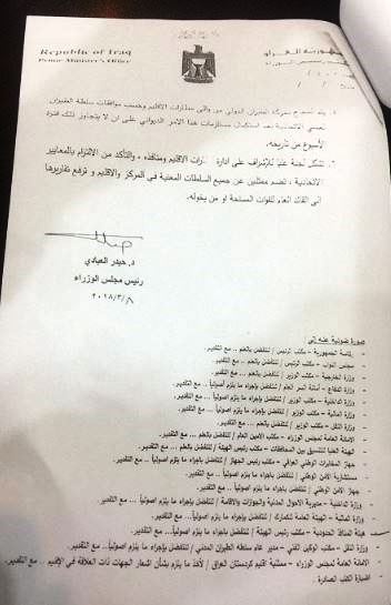 وأوعز العبادي، بـ"تشكيل لجنة عليا للاشراف على ادارة مطارات الاقليم، والتأكد من الالتزام بالمعايير الاتحادية، تضم ممثلين عن جميع السلطات المعنية في المركز والاقليم وترفع تقاريرها الى القائد العام للقوات المسلحة أو من يخوله".